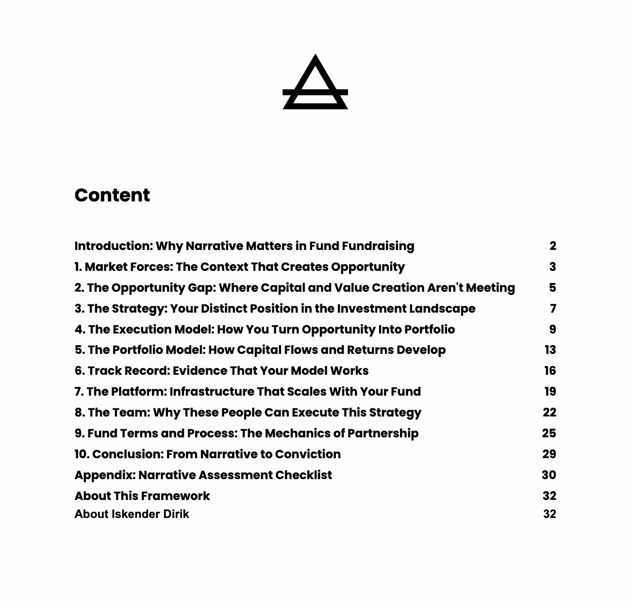 This framework is built for fund managers who understand that fundraising is not just about numbers – it's about building a narrative that creates conviction.